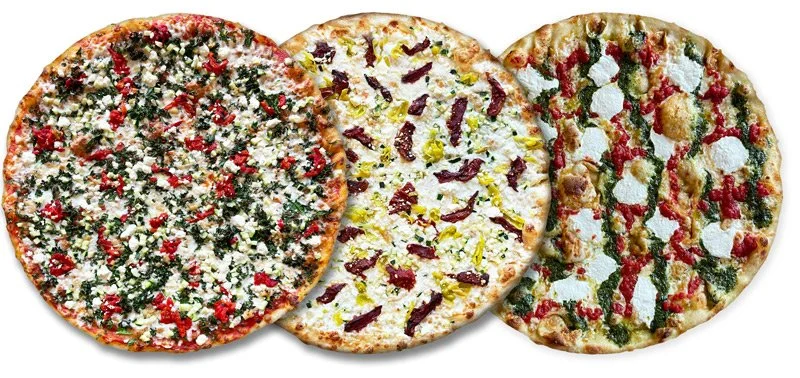 Tangy feta cheese, roasted garlic, roasted red peppers, fresh diced zucchini + fresh chopped kale with creamy mozzarella on a tomato marinara base.